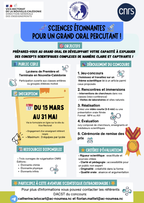 C’est dans ce cadre que le concours intitulé « Chimie et Physique étonnantes pour un Grand Oral percutant ! », labellisé par le CNRS et le concours académique " Sciences de la Vie et de la Terre étonnantes pour un Grand Oral percutant ! " sont ouverts.